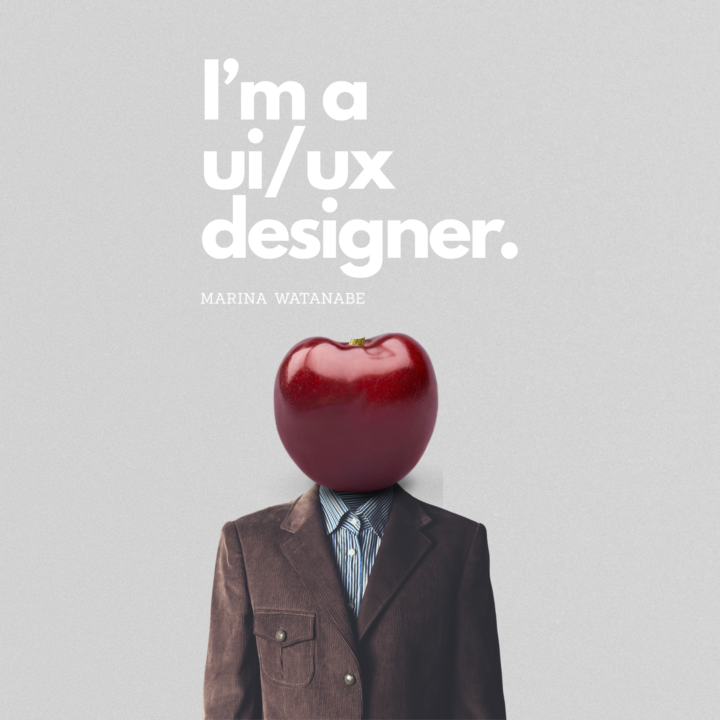 A person in a brown suit and striped shirt with an apple as a head, standing against a gray background with text that says 'I'm a ui/ux designer' and the name Marina Watanabe.