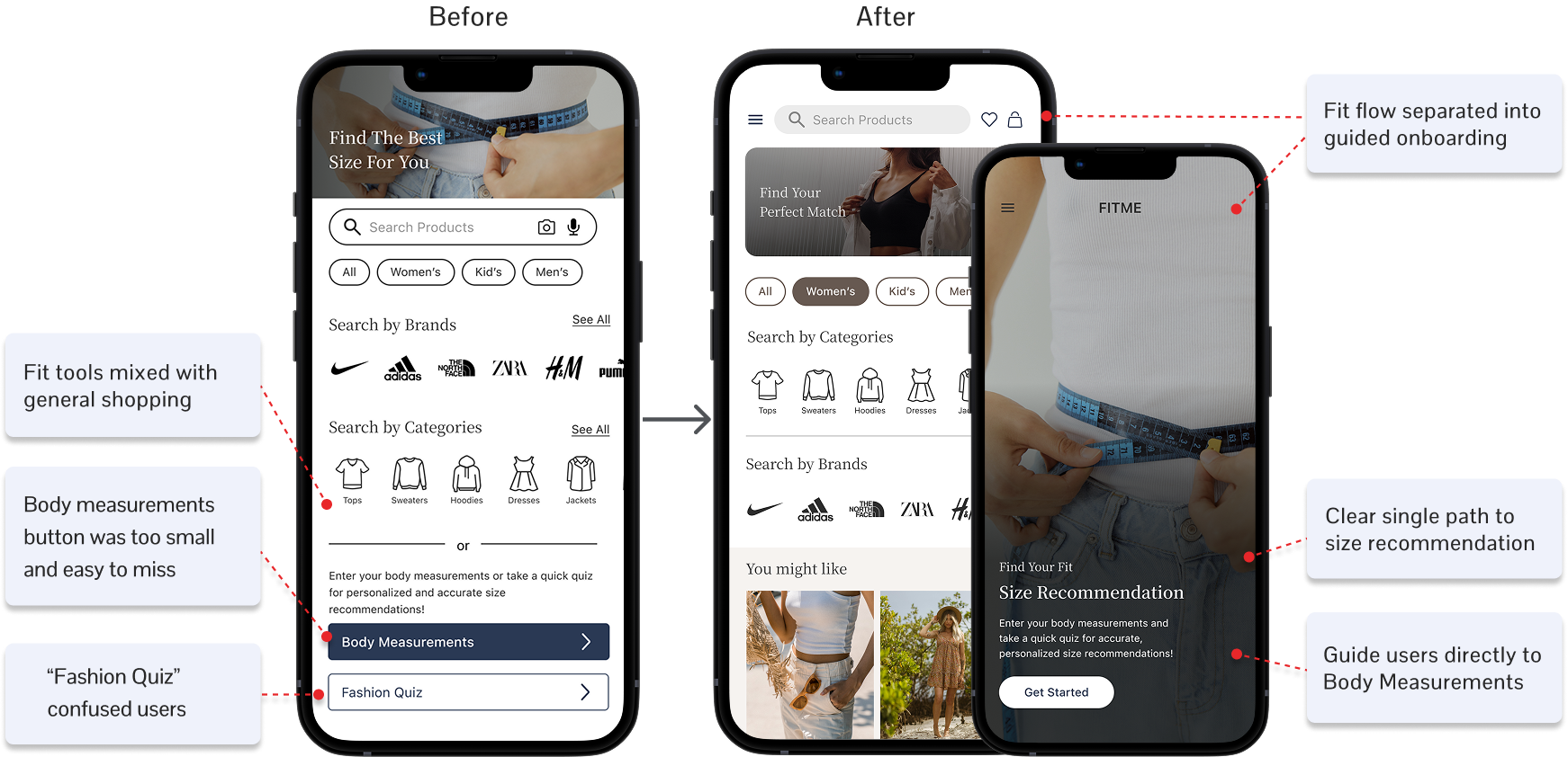 Instead of redesigning the entire shopping journey, I focused on the critical fit-decision moments where size uncertainty impacts purchase confidence.