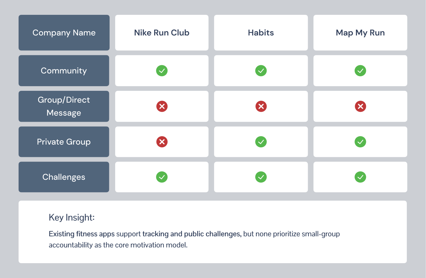 The final prototype presents a focused group-challenge model designed to drive consistency through visible progress and shared accountability, without relying on heavy social features.