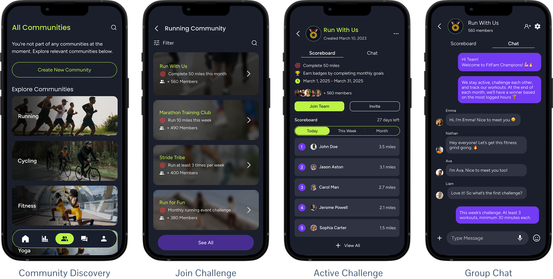 Design a challenge-first fitness experience where small-group participation drives engagement. The product simplifies challenge creation and joining, makes shared progress highly visible, and keeps interaction focused and lightweight.